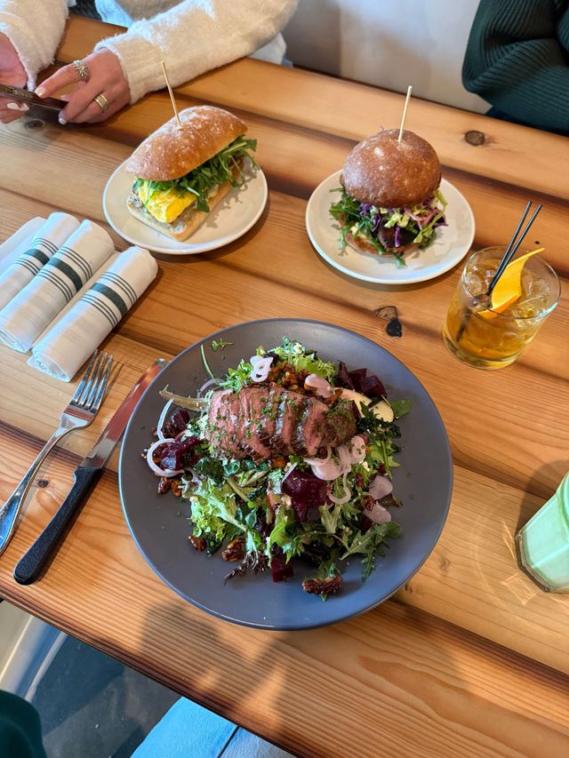 Looking for the perfect spot to meet a friend or have a casual business meeting? 3 Hearts is it. This cozy-industrial café is full of warm wood accents and greenery, making it an inviting place to sip coffee, wine, spirits, or even a fancy mocktail. Their menu is small but thoughtfully curated, with delicious sandwiches, fresh salads, and house-made sourdough you can take home. If you’re in need of a relaxing space with great food and drinks—this is a must-visit!
