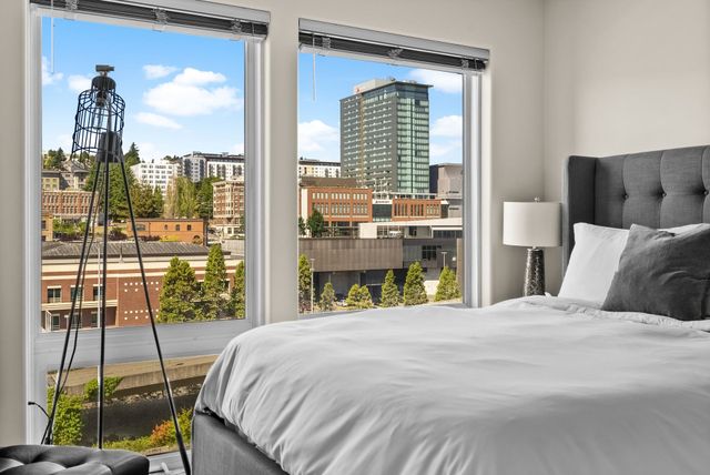 Living downtown puts you in the heart of Tacoma's action, thanks to the iconic Chihuly Bridge that is accessible minutes from your front door. What a treat to cross over and end up on Pacific Avenue with options to many restaurants, shops, museums, and theaters. It's easy to stay active and healthy here with the pedestrian-friendly streets, parks, and scenic waterfront paths steps from the building. The condo amenities provide plenty to do without leaving home. A 24/7 gym, rooftop deck with community barbecue grills and fire pits, club room with big screen TVs- it's got it all.