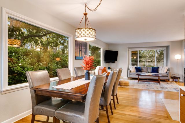 From the moment you enter, the beauty of hardwood floors and the warmth of an iconic mid-century modern corner fireplace will greet you, creating a sense of cozy sophistication. The home has been updated with modern conveniences, including new windows and air conditioning, ensuring comfort in every season.